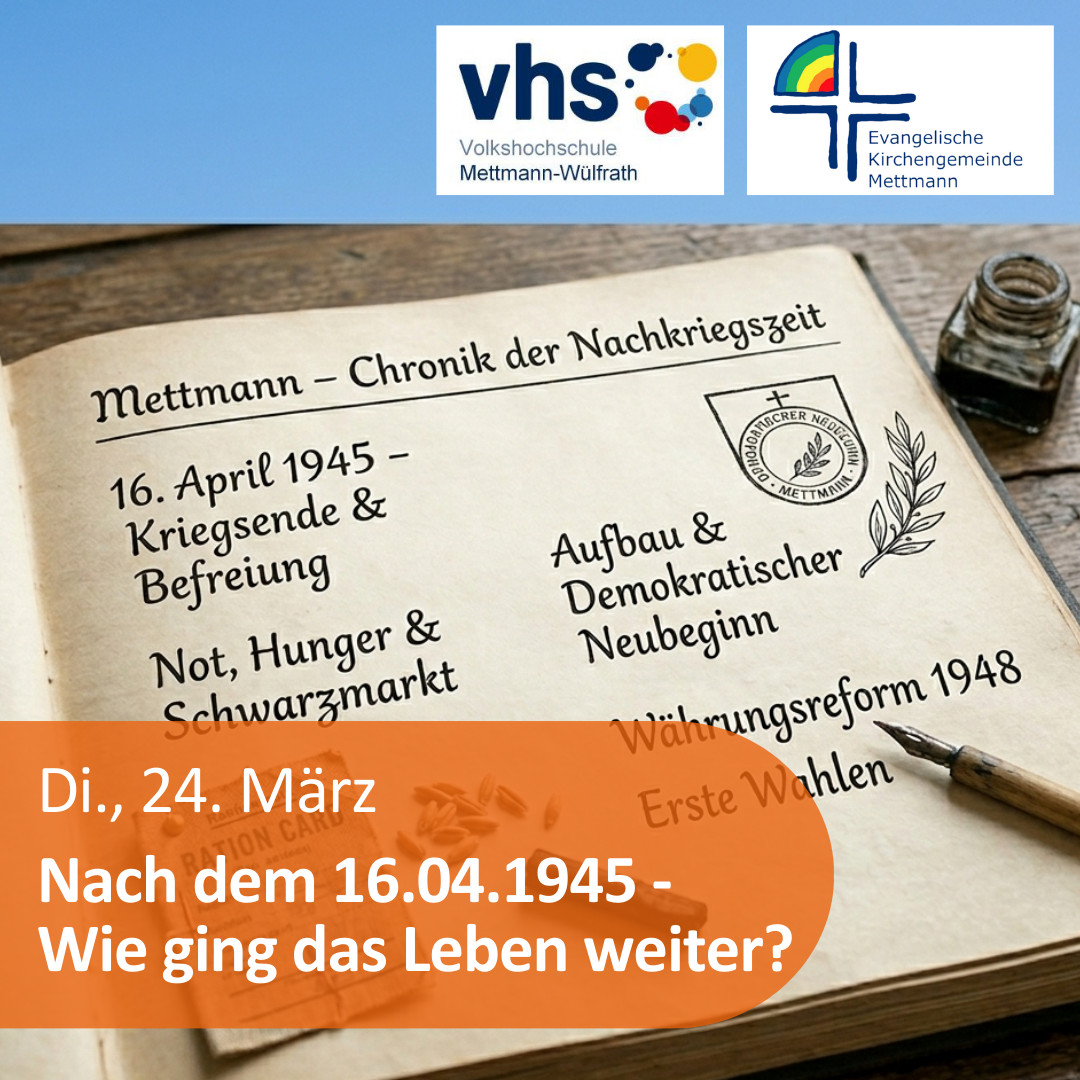 Mit dem Kriegsende begann auch in Mettmann eine Zeit großer Umbrüche. Hungerwinter, Entnazifizierung, Flüchtlingsbewegungen und die ersten demokratischen Strukturen prägten den Alltag. Rainer Köster beleuchtet die unmittelbare Nachkriegszeit und den Wiederaufbau im lokalen Kontext – ergänzt durch historische Filmausschnitte. Im Anschluss besteht Gelegenheit zur Diskussion.